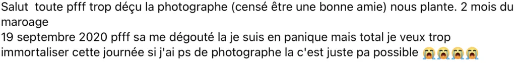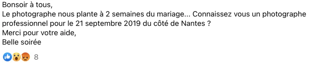 If you get sick and can’t make it, even for another reason, what options do you have? Indeed, it can happen to anyone to get sick, even to the most serious wedding photographer. In this case, his seriousness has already pushed him to prevent this unforeseen situation, by being part of a group of professional photographers in the same style of wedding photography, one of whom could come and replace him. But beware, here’s what you need to know: If the photographer you’ve chosen is charging below-market prices, then he or she will have a really hard time finding someone willing to fill in for below-market prices, and especially at the last minute. Hiring a photographer with a market price means that he will be able to be replaced quite easily, otherwise, he will have to accept to pay the difference. But in most cases, they will leave you out in the cold to find a replacement.